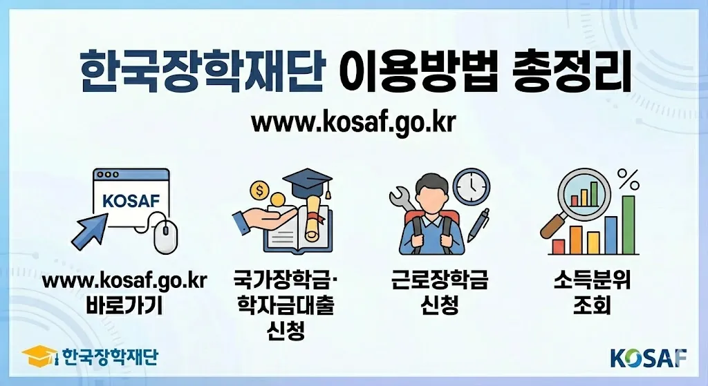한국장학재단 홈페이지에 대해 알아보았습니다. 국가장학금, 학자금대출, 근로장학금 등 다양한 학자금 지원제도를 한 곳에서 신청하고 관리할 수 있습니다. 문의사항은 한국장학재단 상담센터(1599-2000, 평일 09:00~18:00)로 연락하세요. 더 자세한 정보는 아래 버튼을 통해 확인하세요.